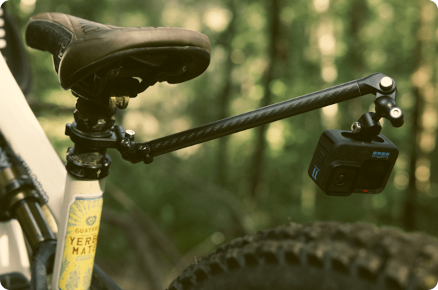 Boom + Bar Mount har förlängningsarmar i kolfiber som enkelt kan fästas på de flesta runda styre och sadelstolpar för att få fullspektrumbilder av dig vänd mot kameran, följ kamerabilder eller sidobilder av dig på din cykel. Den har också integrerade vridpunkter och ett kamerafäste med kulled som låter dig få den exakta fångstvinkeln du vill ha.