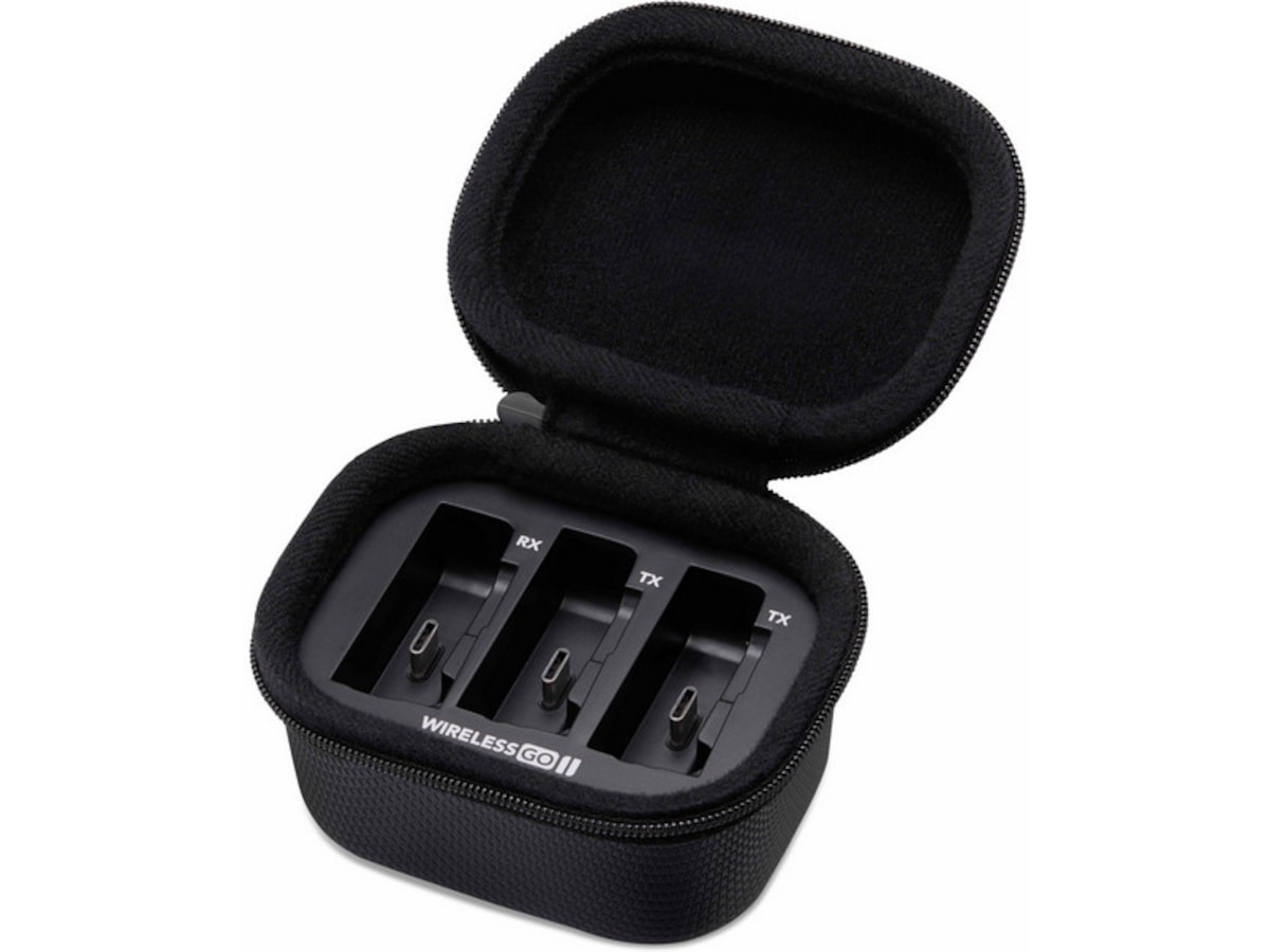 Charge Case för Wireless GO II är en bekväm lösning för att säkert förvara, transportera och ladda ditt trådlösa kit på resan eller hemma.