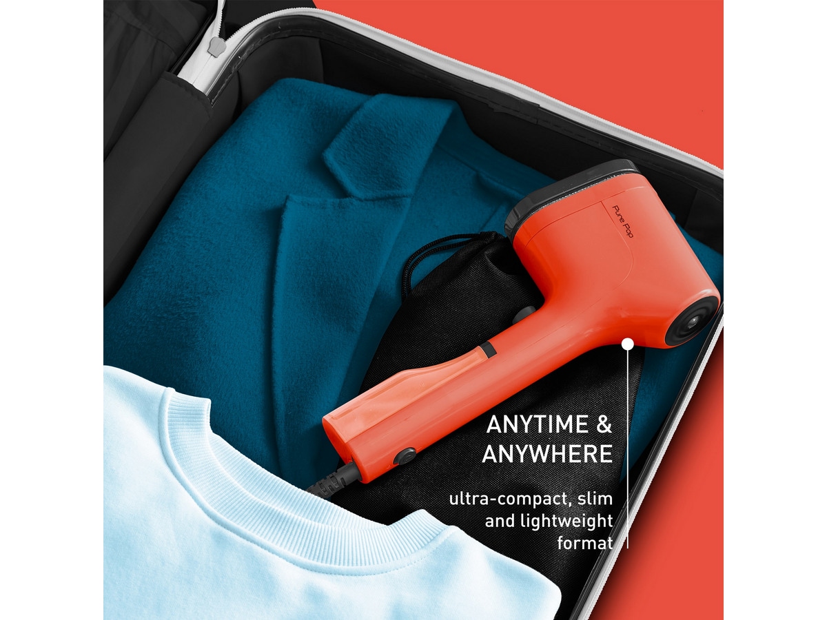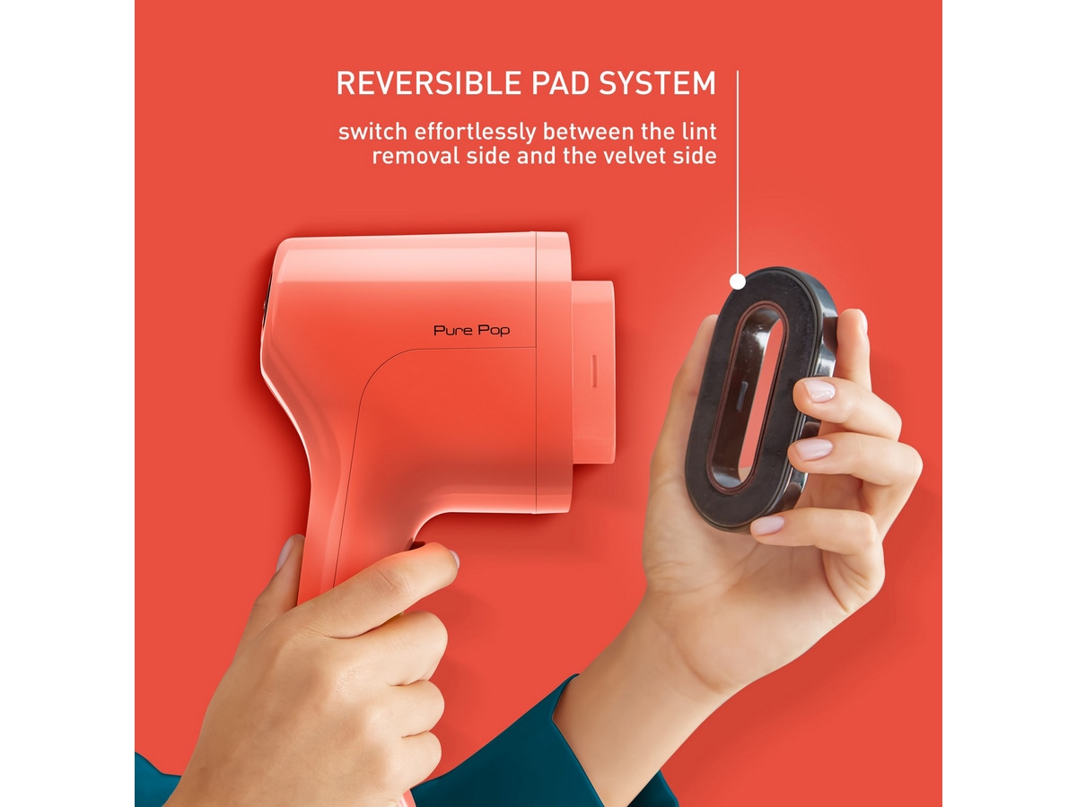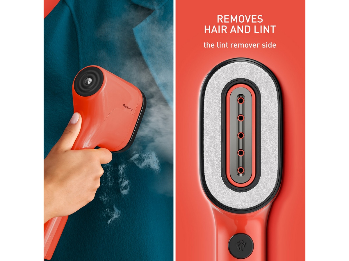 Pure POP är en handhållen ångbåt med ett vändbart munstycke. Det gör att du inte behöver ta med olika tillbehör för olika behov, eftersom de alltid finns på plats. Ena sidan av munstycket är täckt med sammet för ömtåligare plagg. Den andra sidan är täckt av tyg, så att du kan fånga ludd och hår utöver ångande.