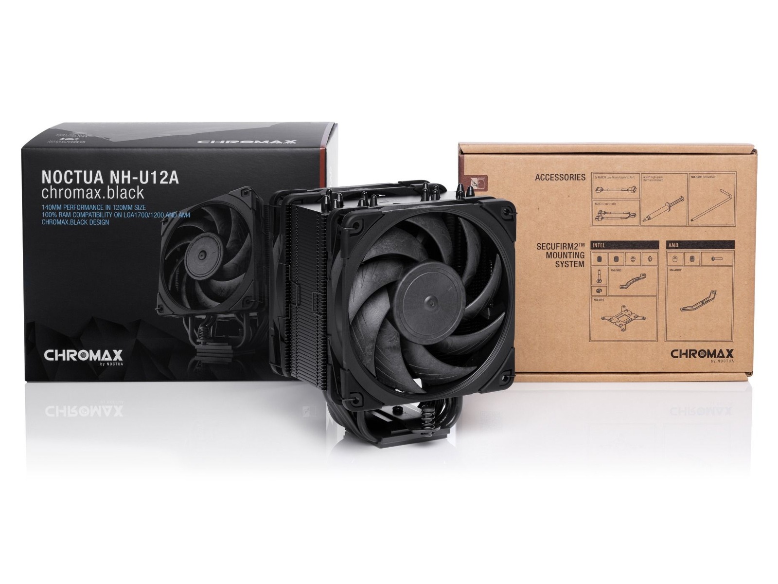 NH-U12A chromax.black är svart från topp till tå: med en svartbelagd kylfläns, en svart fläkt med svarta anti-vibrationskuddar, svarta fläktklämmor och svarta monteringsdelar, passar den perfekt i helsvarta byggen och är lätt att integrera med andra färgscheman.