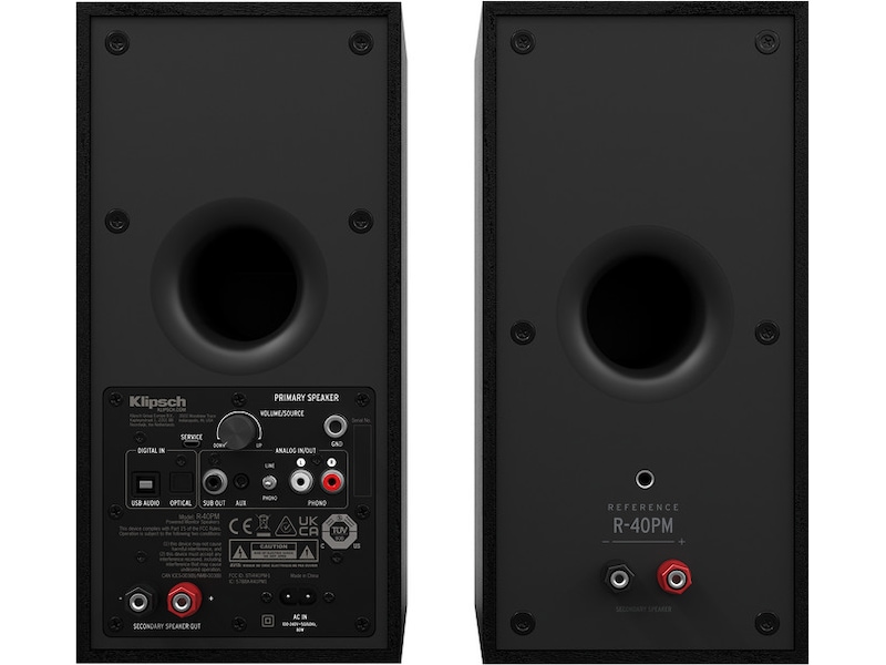 De R-40PM-drivna högtalarna ansluts via Bluetooth® för musikströmning, phono (med jordskruvterminal) för skivspelare, plus digitala och analoga för allt däremellan. Och eftersom Klipschs ingenjörer har byggt in en skräddarsydd förstärkare får du perfekt avstämda ljudupplevelser – ingen audio/video-mottagare (AVR) krävs.
