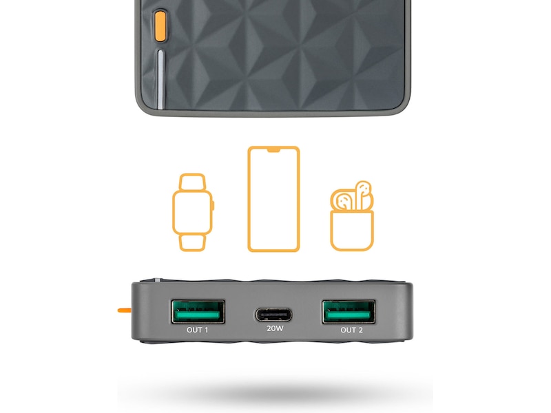 Denna Power Bank har all den senaste tekniken och nya funktioner som ger dig nästa generations laddningshastigheter. Den har 2 USB-utgångar och en extra kraftfull 20W USB-C som är designad för att ladda din smartphone snabbare än någonsin.