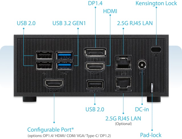 - Omfattande anslutning: Stöd för 7 USB-portar, valfri 2:a 2.5G LAN och stöd för DP1.4/VGA/COM/HDMI/USB Type-C med DP1.4 som konfigurerbara portalternativ