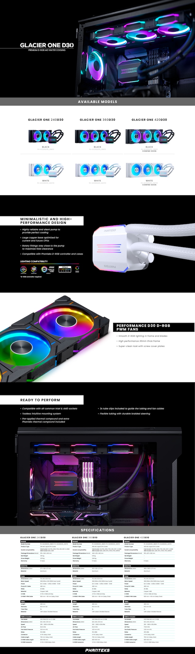 Glacier One D30 AIO-kylare är en högpresterande kyllösning som erbjuder en smidig D-RGB-belysningslösning tack vare D30-fläktarna. Glacier One D30 AIO-kylaren utrustad med D30-fläktar, kan kopplas ihop och styras via en enda kabel. Dess stora kopparbas och fenarray gör den lämplig för användning med avancerade processorer, medan dess design möjliggör maximalt spelrum med moderkort och RAM-komponenter.