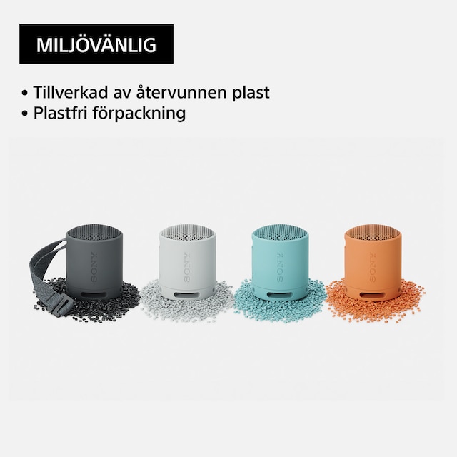 XB100 är byggd för livet på språng tack vare sin lätta vikt och lilla storlek. Dessutom levereras den med ett flervägsband som du kan använda för att bära eller fästa din högtalare. Xb100 är tillverkad av återvunnen plast och kommer i plastfria förpackningar.