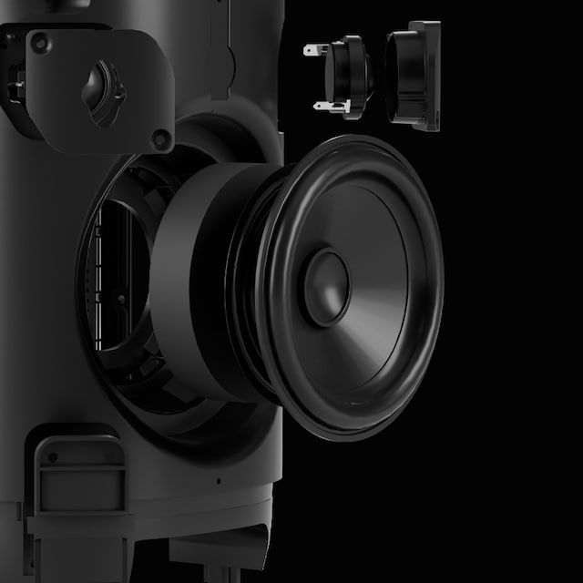 Placerad i ett förseglat hölje och drivs av avancerad digital signalbehandling, producerar den precisionjusterade bashögtalaren djup, dynamisk och ren bas.