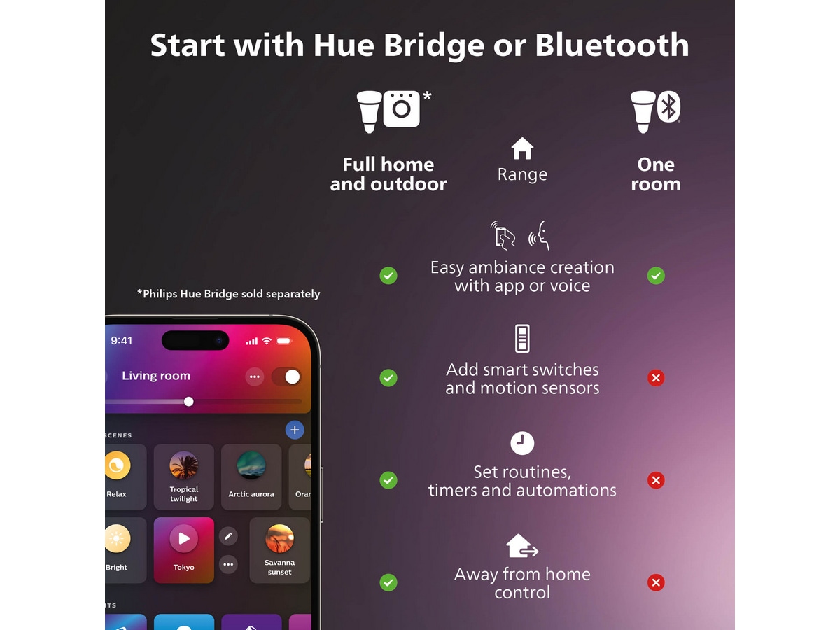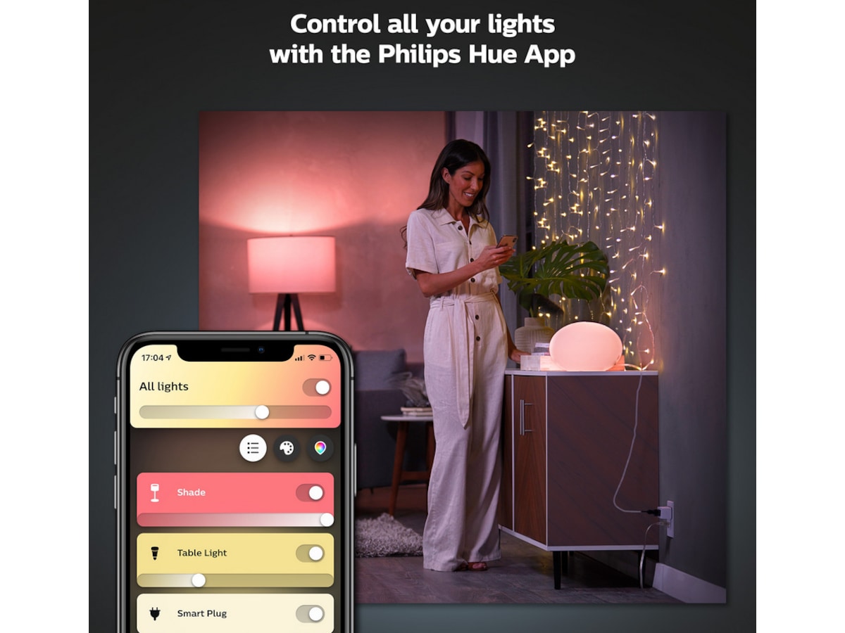 Med detta lilla, oansenliga tillbehör kan du förvandla alla lampor – även de där du inte kan använda Hue-ljuskällor – till smarta lampor som du kan styra med din röst eller Hue-appen. Styr ljuset direkt via Bluetooth i ett rum, eller anslut till Hue Bridge för att komma åt alla funktioner.