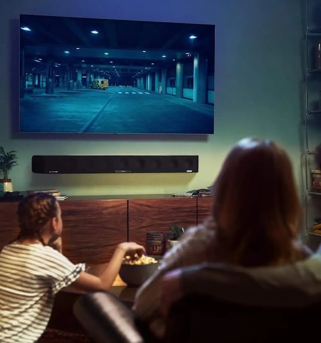 Få din egen hemmabio utan att fylla rummet med högtalare. -AMBEO Soundbar Plus ger en verklighetstrogen ljudupplevelse i en kompakt enhet, vilket gör att du är mitt i händelsernas centrum.