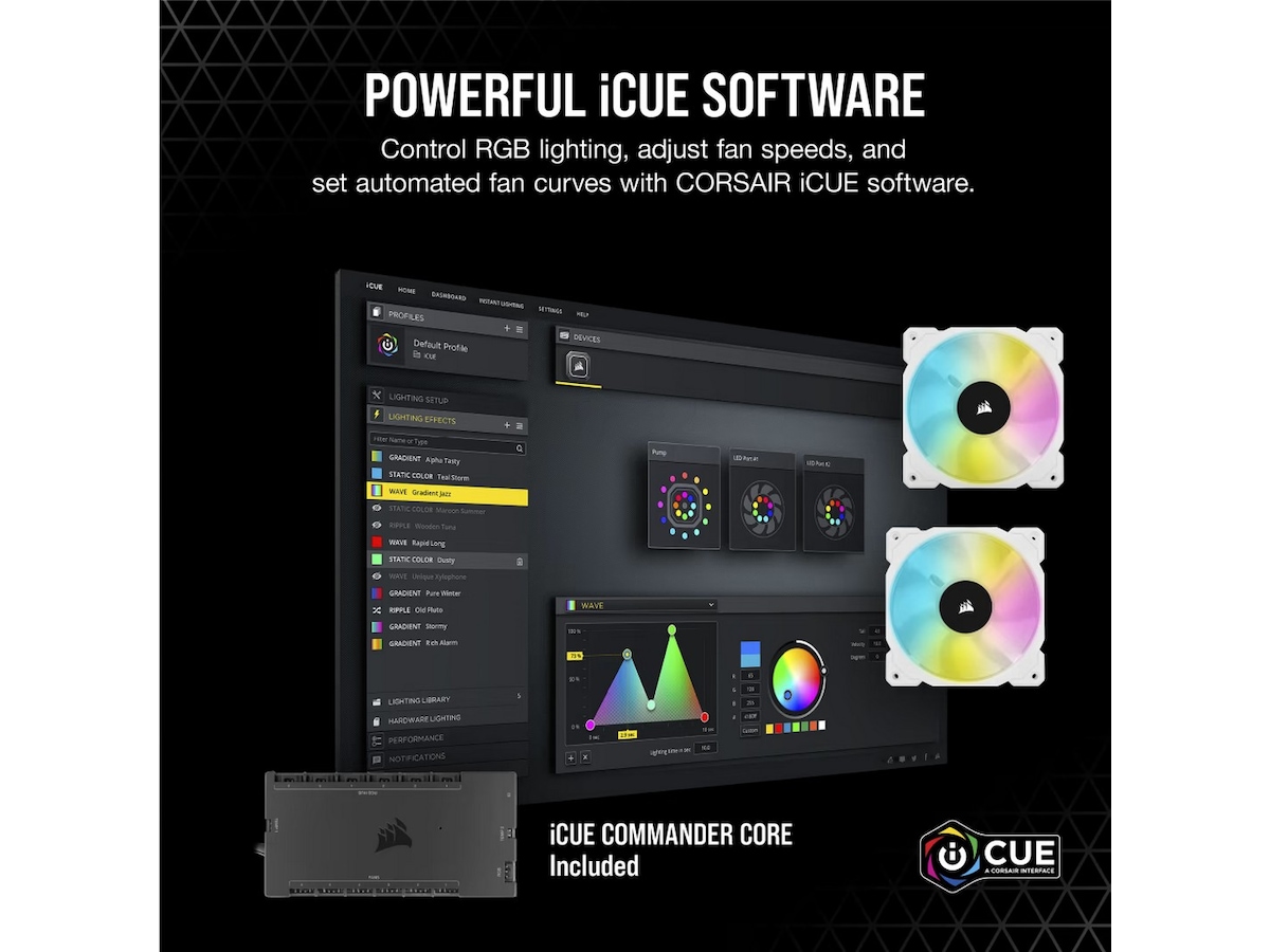 Utnyttja kraften i iCUE med den medföljande iCUE Commander CORE för att styra fläkthastigheten och RGB-belysningen för de medföljande ML RGB-fläktarna, med potential att styra ytterligare CORSAIR RGB-fläktar, upp till totalt sex.