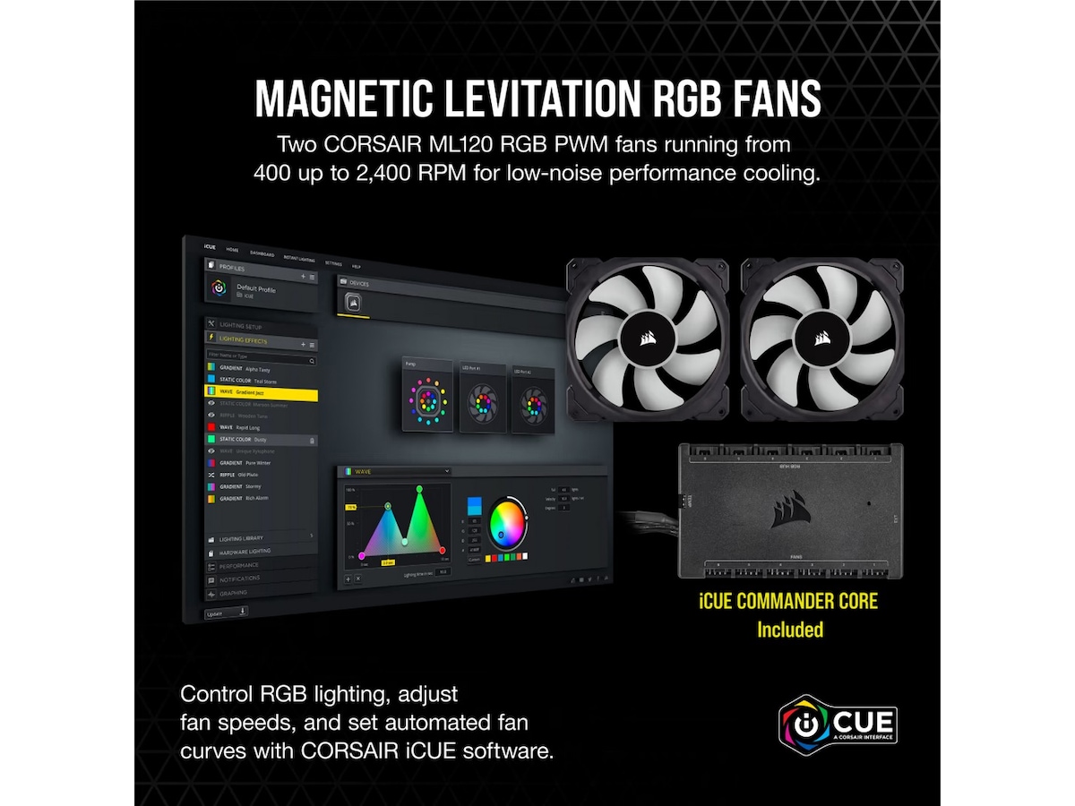Utnyttja kraften i iCUE med den medföljande iCUE Commander CORE för att styra fläkthastigheten och RGB-belysningen för de medföljande ML RGB-fläktarna, med potential att styra ytterligare CORSAIR RGB-fläktar, upp till totalt sex.
