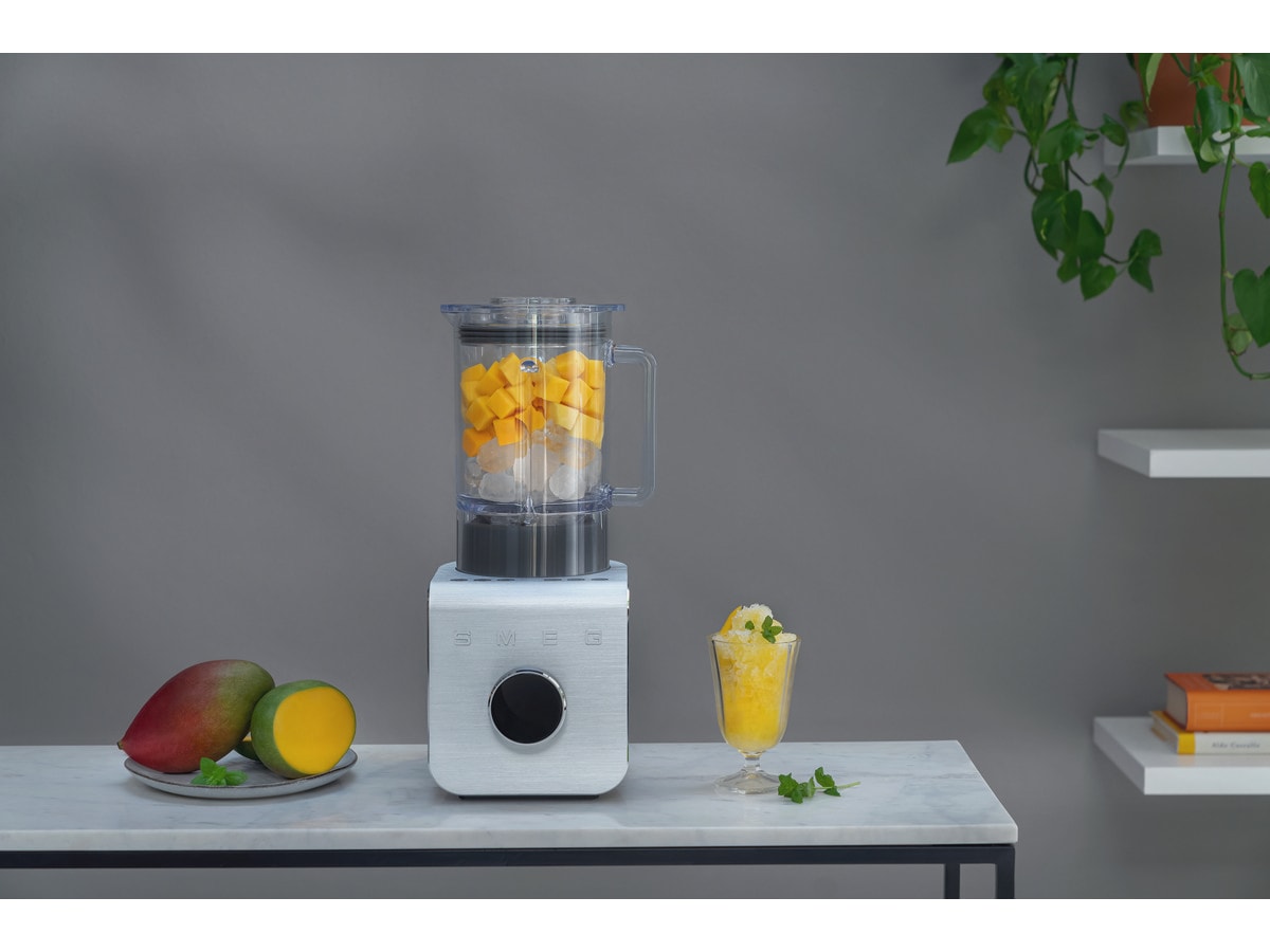Smegs högpresterande blender BLC kan perfekt kombinera olika texturer, vilket gör att du kan blanda ingredienser för en mängd olika förberedelser tack vare de dedikerade automatiska programmen: Smoothie för en krämig fruktjuice eller en yoghurt, Grön Smoothie för en specifik behandling av gröna bladgrönsaker, Frozen Dessert för färska skeddesserter och Ice Crush för att krossa is eller förbereda uppfriskande cocktails och isdrycker.