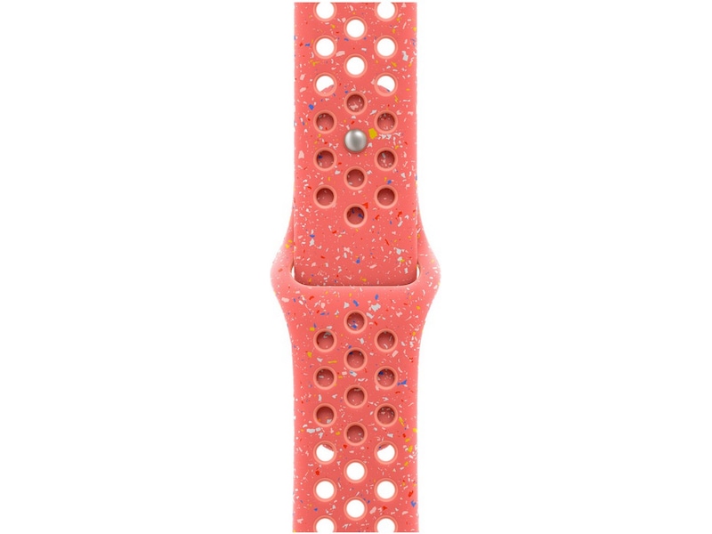 Det är tillverkat med formpressade hål som släpper igenom luft och som gör Nike-sportbandet både tåligt och starkt, men samtidigt förvånansvärt mjukt. Det har färgflingor som skapar ett slumpmässigt mönster som gör varje armband helt unikt. Det mjuka, täta materialet sitter följsamt runt handleden och känns skönt mot huden. Ett stiftspänne i aluminium ger stiftet en ny matt finish.