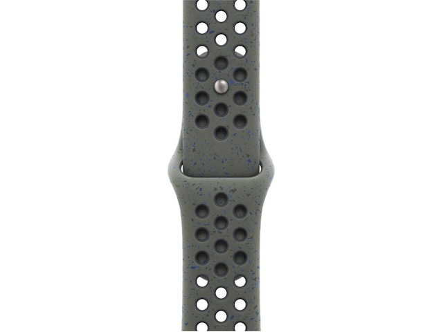 Det är tillverkat med formpressade hål som släpper igenom luft och som gör Nike-sportbandet både tåligt och starkt, men samtidigt förvånansvärt mjukt. Det har färgflingor som skapar ett slumpmässigt mönster som gör varje armband helt unikt. Det mjuka, täta materialet sitter följsamt runt handleden och känns skönt mot huden. Ett stiftspänne i aluminium ger stiftet en ny matt finish.