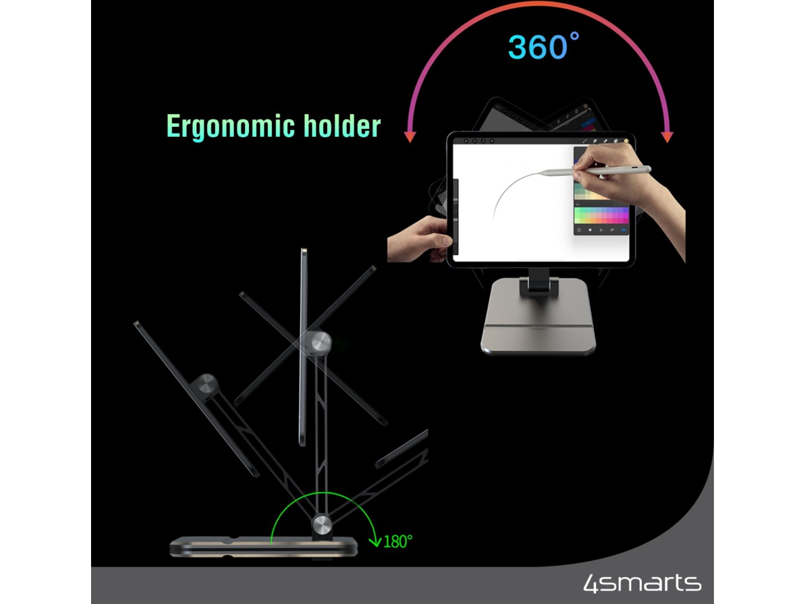 Fästet tillåter 360-graders rotation för att fixera din iPad både horisontellt och vertikalt. Denna flexibilitet gör att du kan justera iPad till valfri position för en optimal användarupplevelse. Fodralet till tabletthållaren är vikbart, vilket gör den lämplig för mobil användning. Den kan enkelt vikas ihop och förvaras i en påse eller låda. Så du kan ta med dig hållaren överallt och hålla din iPad säker och stabil hela tiden. Vår 4smarts-hållare är en idealisk lösning för att använda din iPad bekvämt och säkert. Den ger möjlighet att justera vridarmen upp till 180 grader för att optimalt placera iPadens höjd.