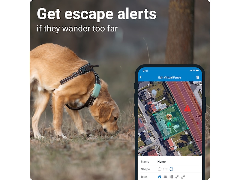 Ange trygga områden (som din trädgård) samt förbjudna platser (som vissa delar av skogen). Din hund-GPS skickar snabbt en notis så snart vovven lämnar eller återvänder till ett virtuellt staket.