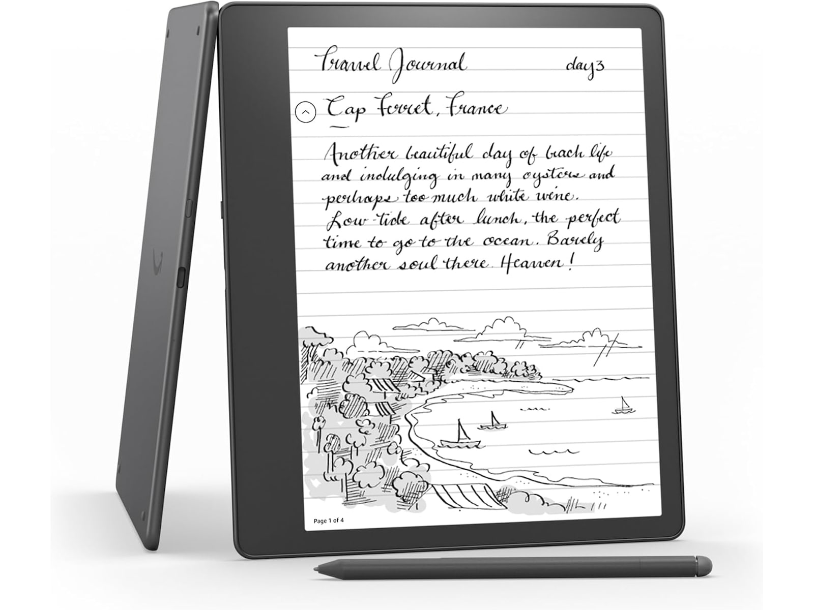 Kindle Scribe är den första Kindle som innehåller en digital anteckningsbok och penna. Läs och kommentera i böcker eller dokument, eller skriv ner att göra-listor, gör mötesanteckningar eller journal i en separat anteckningsbok. Dess stora frontbelysta display är 2 gånger större än Kindle Paperwhite.