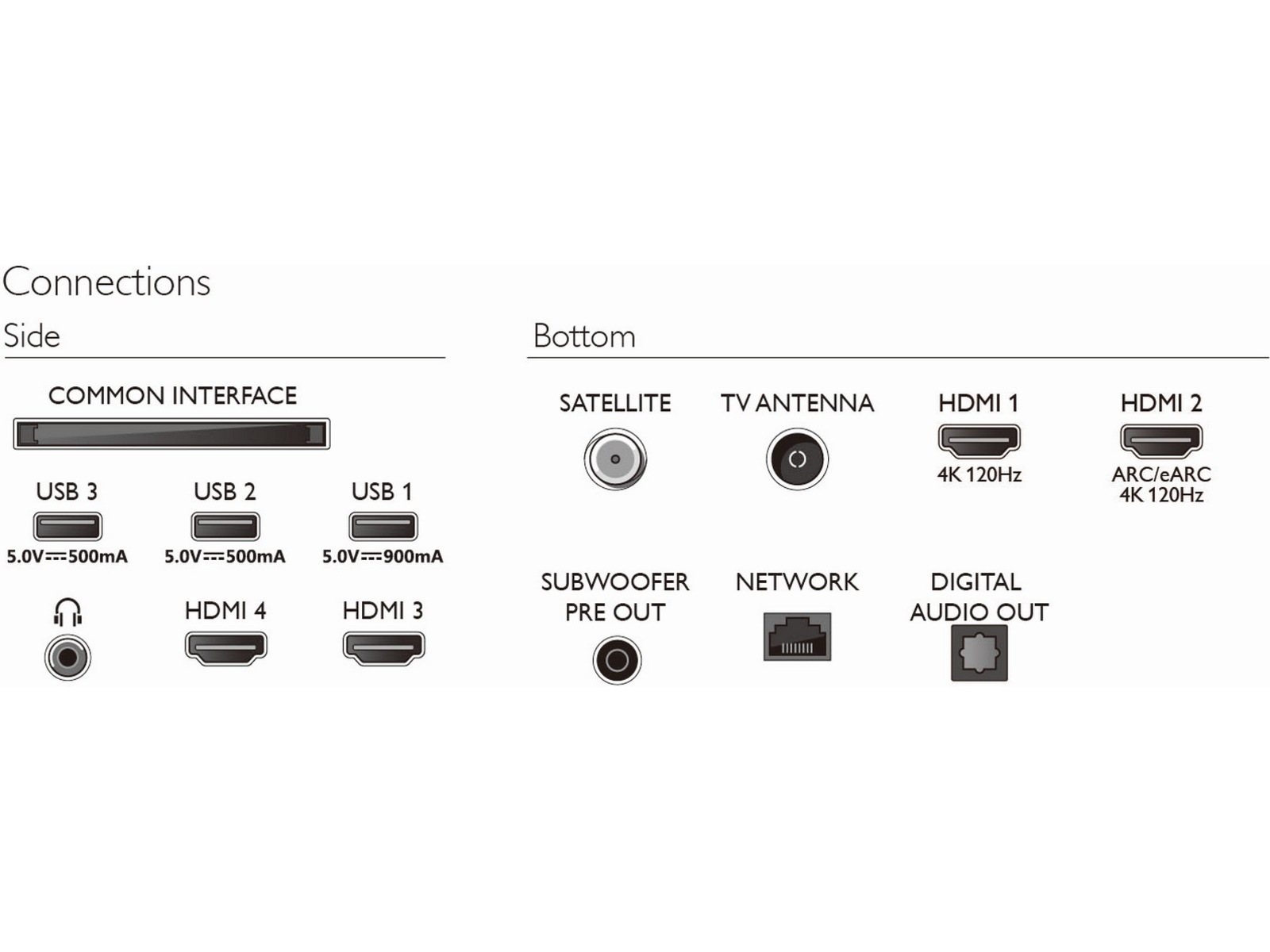 Anslutningstyp Digital ljudutgång (optisk) - nedre del, 3 x USB - sida, Utgång för bashögtalare - nedre del, 2 x HDMI - nedre del, Hörlurar - sida, 2 x HDMI - sida, LAN - nedre del