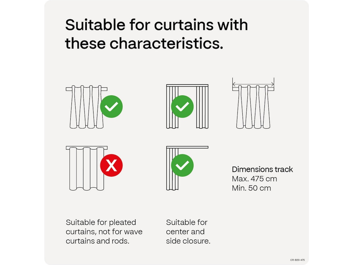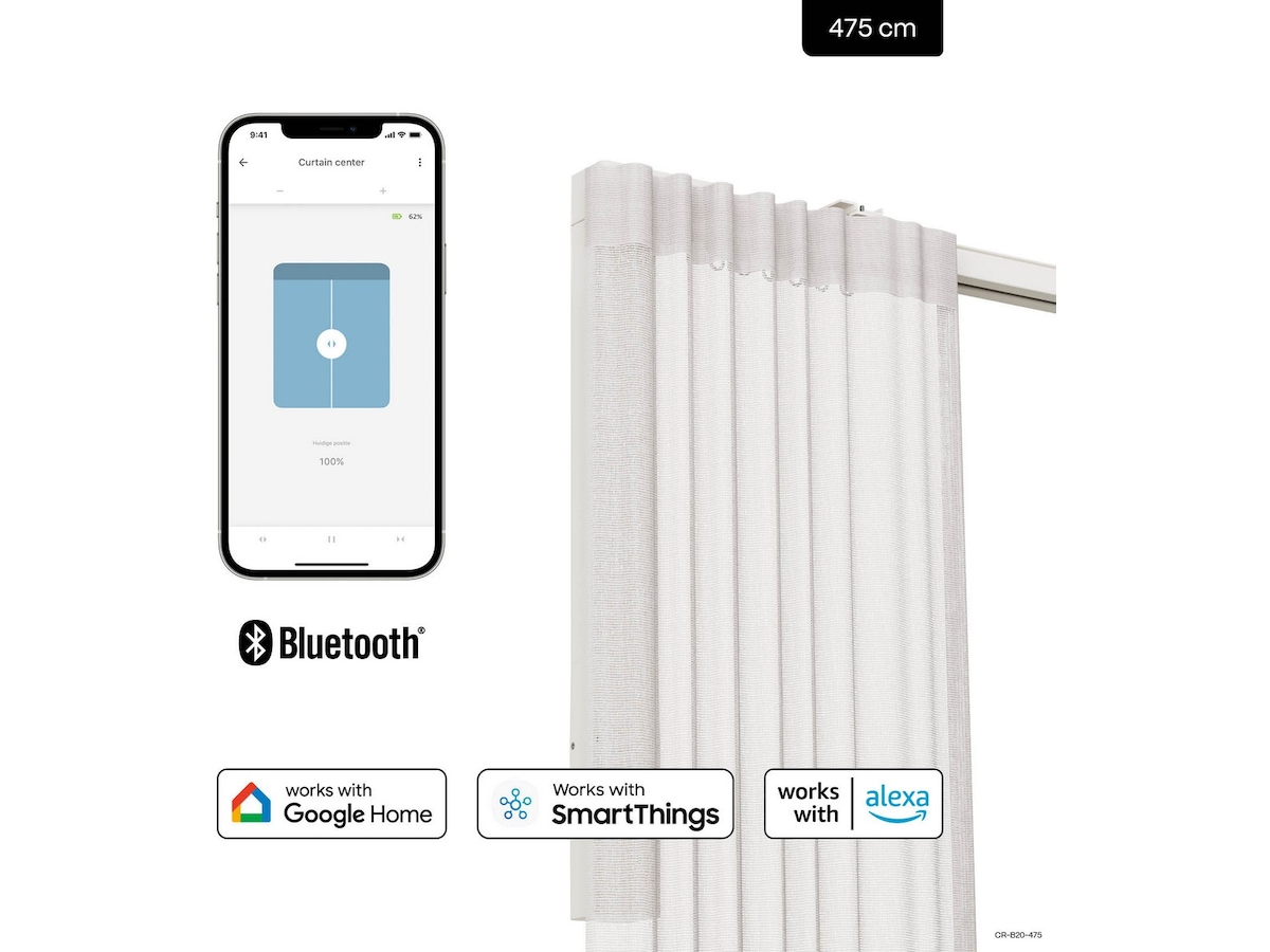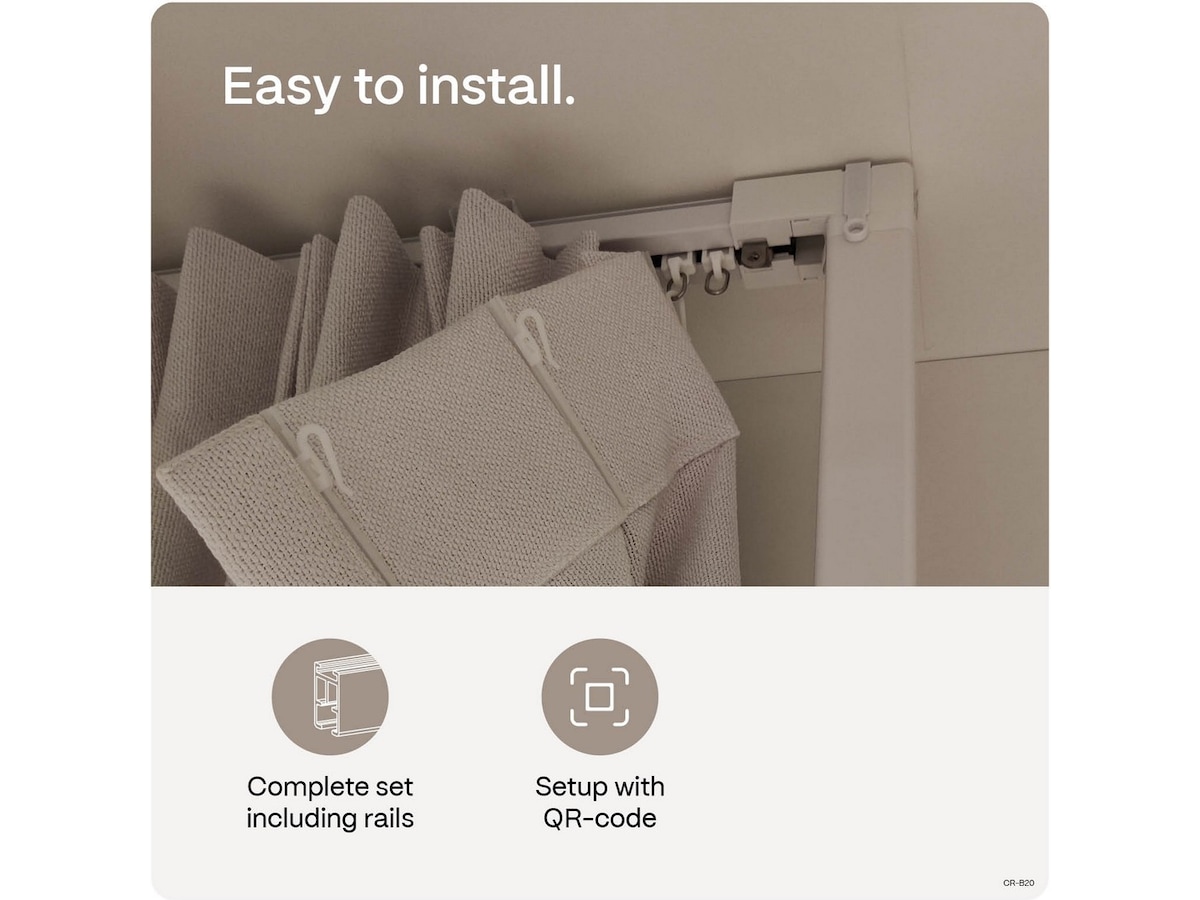 Denna smarta motoriserade gardinsats består av en gardinskena och en MotionBlinds-motor, som driver skenan. MotionBlinds eftermonterade gardinmotor är således enkel att installera med dina befintliga plisségardiner. Det är mycket enkelt att sätta upp den motoriserade gardinskenan. Du kan göra detta utan fjärrkontroll med din smartphone. När du har installerat gardinen, ladda ner den kostnadsfria MotionBlinds Bluetooth-appen. Genom appen skannar du av den unika inställningskoden för din gardin, varefter du ställer in ändlägena i några enkla steg. Mellan dessa vänster och höger positioner kan gardinen röra sig fram och tillbaka. Den trådlösa motorn har ett inbyggt batteri som kräver laddning en eller två gånger om året med den medföljande USB-C-kabeln.
