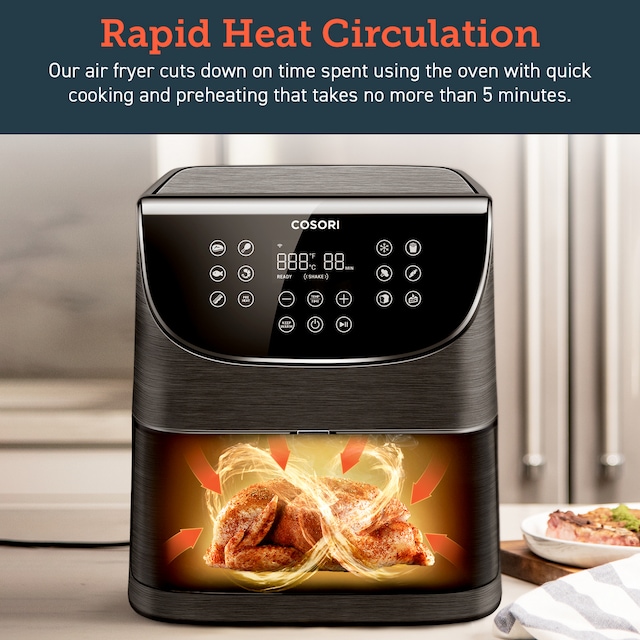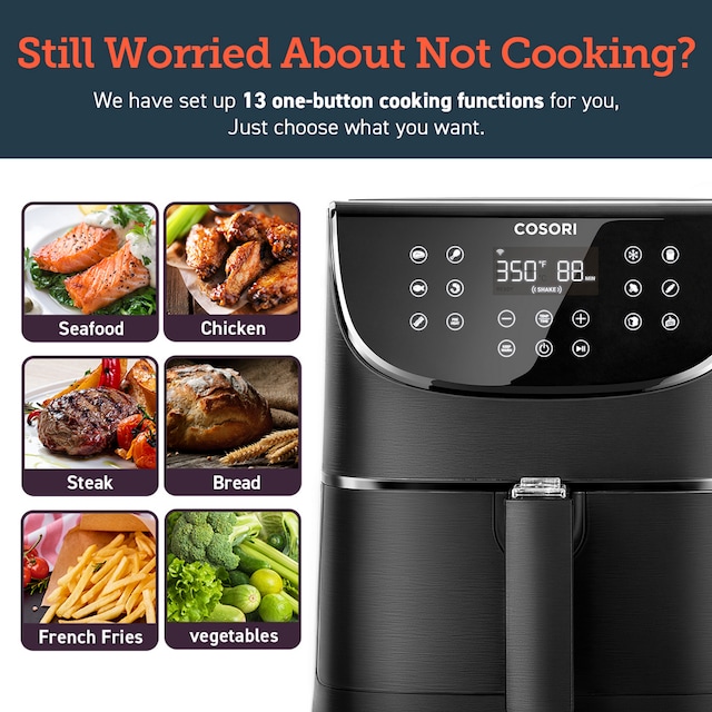 Oavsett vilken skicklighet du har i köket eller hur hektiskt ditt schema blir, kan alla njuta av krispiga, perfekt tillagade måltider på bara några minuter med COSORI CS158. Njut av samma krispiga texturer som du älskar med upp till 85 % mindre fett än traditionellt stekt mat och inga friterade matlagningsångor kvar i köket efteråt.