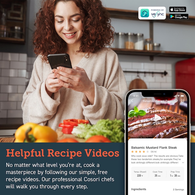 Oavsett vilken kompetensnivå du har i köket, gör 100 detaljerade steg-för-steg-recept med kompletterande videor i VeSync-appen matlagningen enkel.