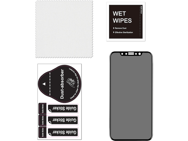 Förpackningsinnehåll Dammupptagare, Skärmskydd, Rengöringsduk, Våta rengöringsdukar, Vägledningsklistermärken