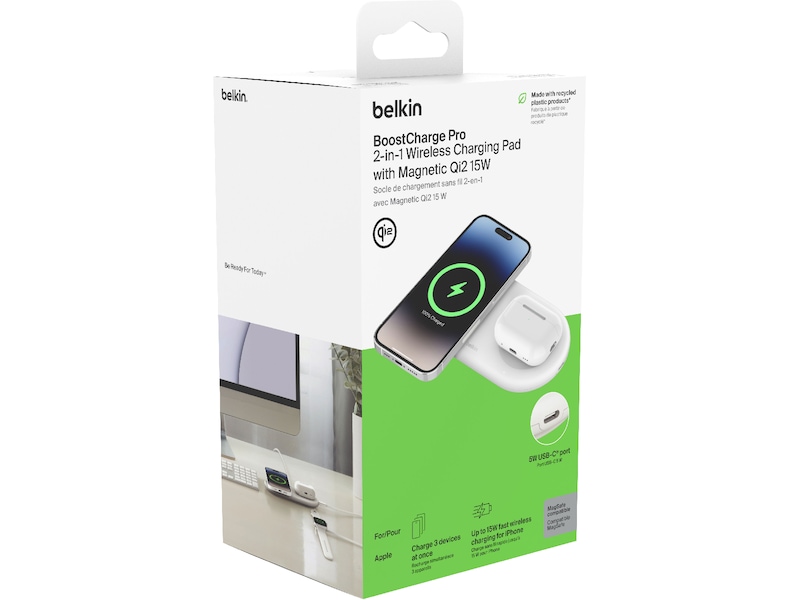 Den här extremt smidiga laddningsplattan ger 15 W snabb trådlös laddning för din iPhone 12 och senare, 5 W för dina AirPods, och 5 W för ytterligare en enhet från en USB-C®-port. Genom att dra nytta av tekniken Qi2, kan du bara placera din iPhone på laddningsstället för att skapa en säker, justerad anslutning.