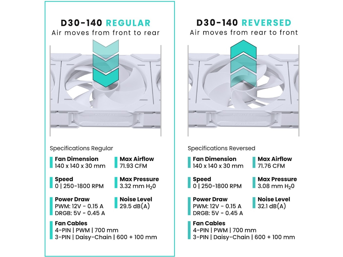 D30-140 kombinerar premium D-RGB-belysning med 30 mm tjocka och aerodynamiska fläktblad inspirerade av den ultimata T30-fläkten, vilket gör den till en riktig premium D-RGB-fläkt för moderna system. D30-140 kommer i två luftflödesriktningsmodeller, vanlig och omvänd. Detta unika alternativ möjliggör den ultimata fläktkonfigurationen för alla system.
