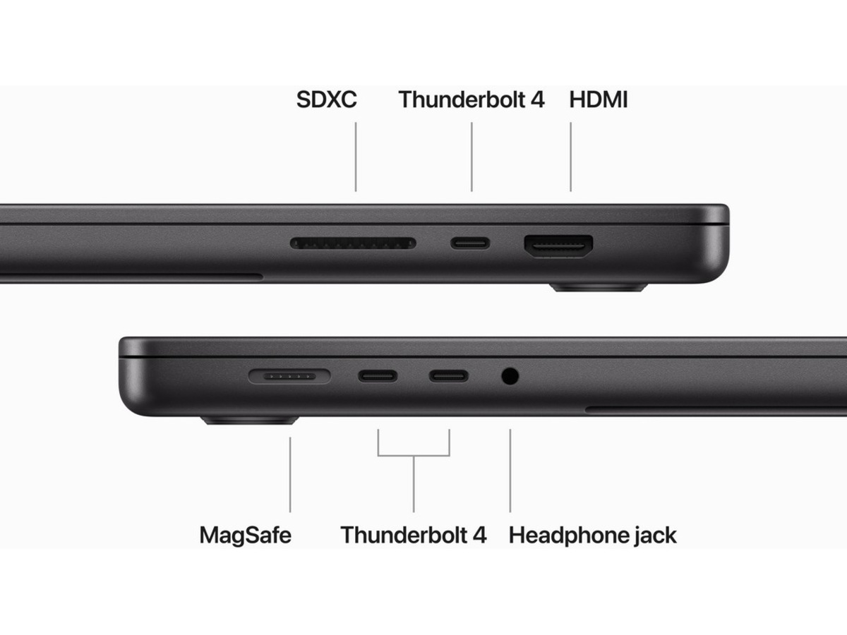 - ANSLUTA TILL ALLT – Denna MacBook Pro har en MagSafe-laddningsport, tre Thunderbolt 4-portar, en SDXC-kortplats, en HDMI-port och ett hörlursuttag. Få snabb trådlös anslutning med WiFi 6E (5) och Bluetooth 5.3. Och du kan ansluta upp till två externa skärmar med M3 Pro, eller upp till fyra med M3 Max.