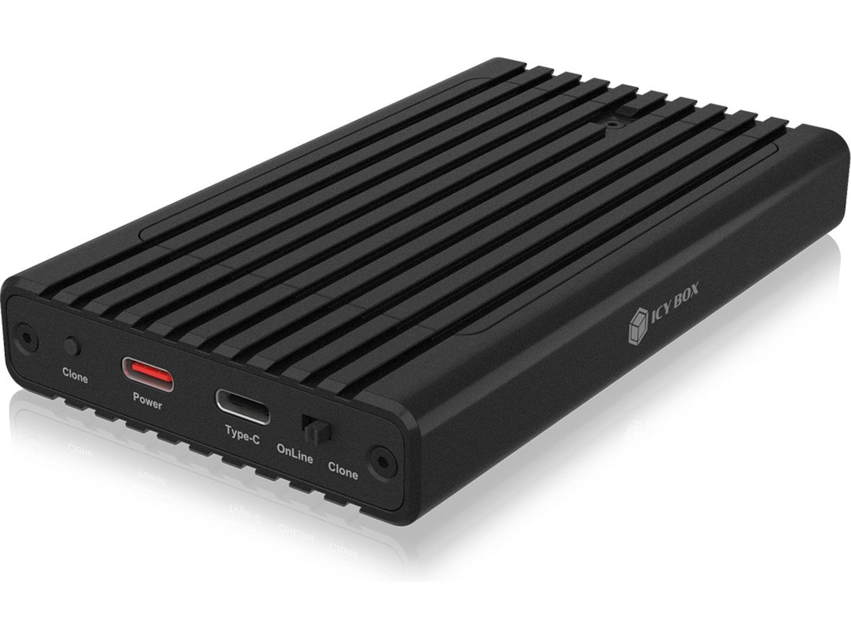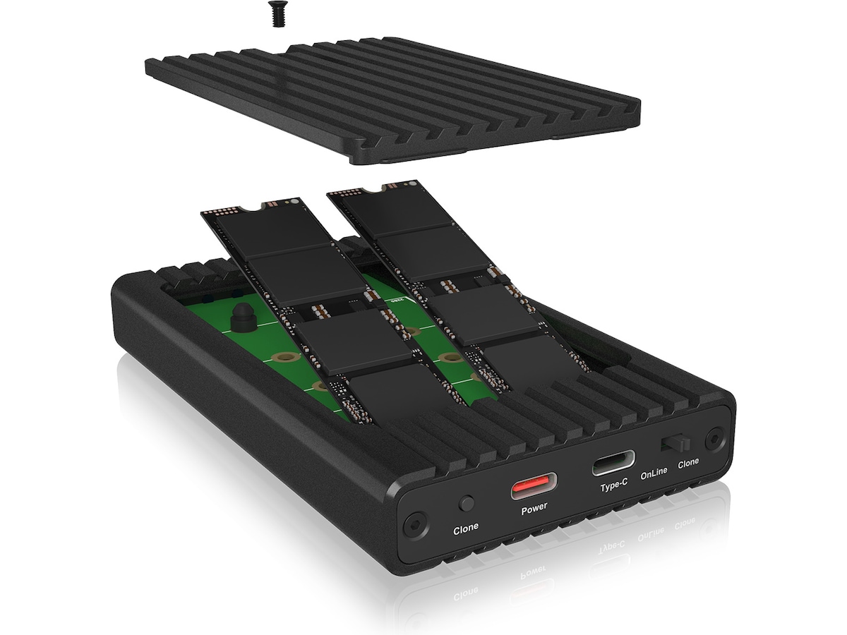 Huset är tillverkat av högkvalitativt aluminium. Detta säkerställer inte bara ett förstklassigt utseende, det resulterar också i en effektiv värmeavledning. SSD:er förblir svala även under krävande uppgifter tack vare direktkontakt med värmeledningsdynor fästa på locket.
