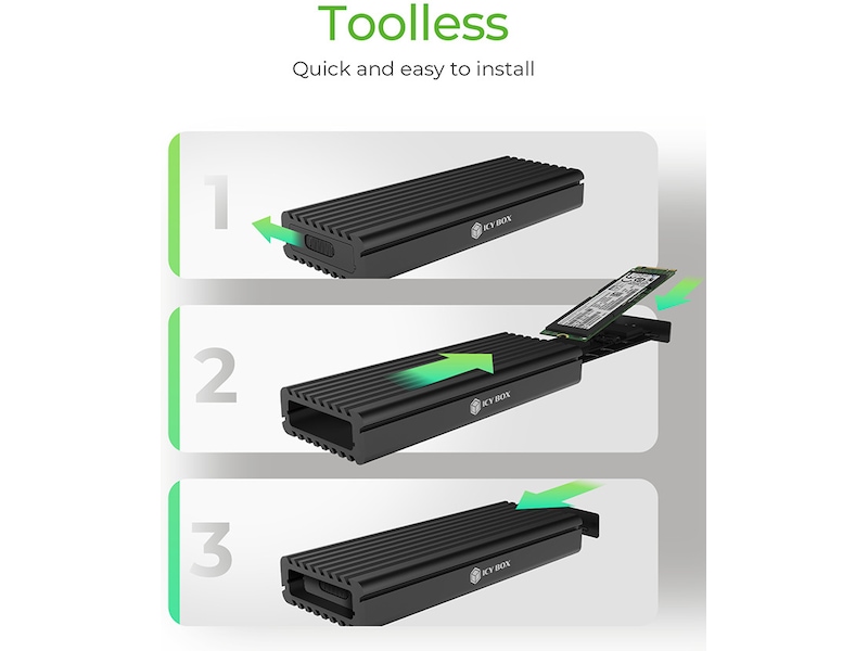 Du kan installera din M.2 SSD i IB-1817MCT-C31 höljet utan några verktyg: öppna helt enkelt spärren, fäst SSD:n i fästet och stäng höljet igen. Du kan sedan utbyta data med hastigheter på upp till 10 Gbit/s via USB Type-C®-anslutningen.