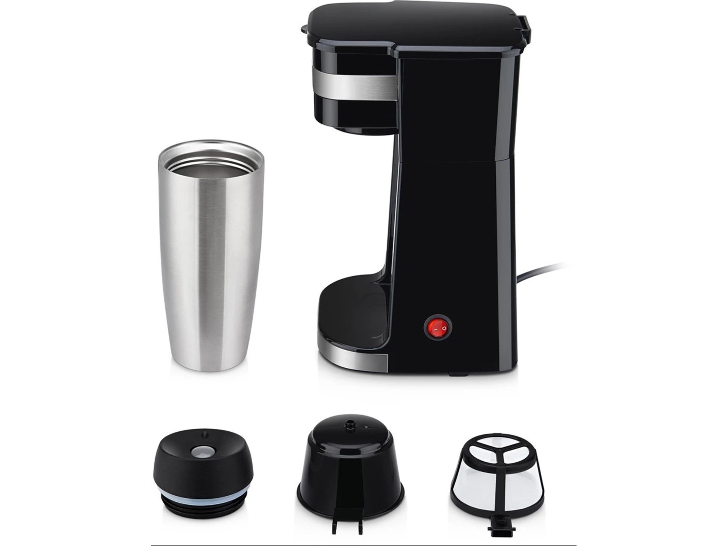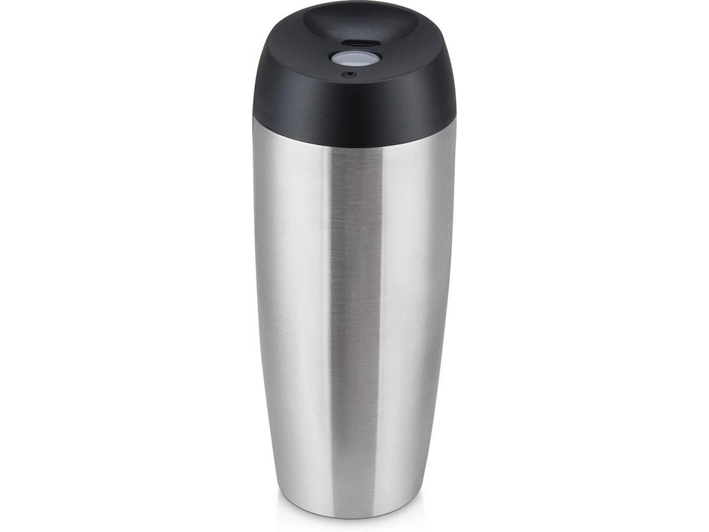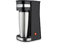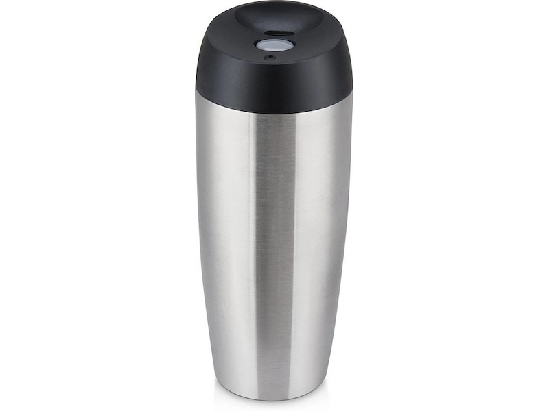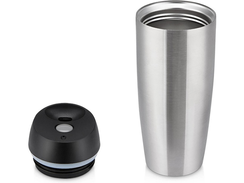 Den medföljande termoskoppen är gjord av tvålagers rostfritt stål och har ett plastlock med värmetåligt skydd. Detta gör den idealisk för att ta med dig ditt kaffe och njuta av det på språng, oavsett om du är i bilen, på bussen eller på väg till jobbet eller skolan.