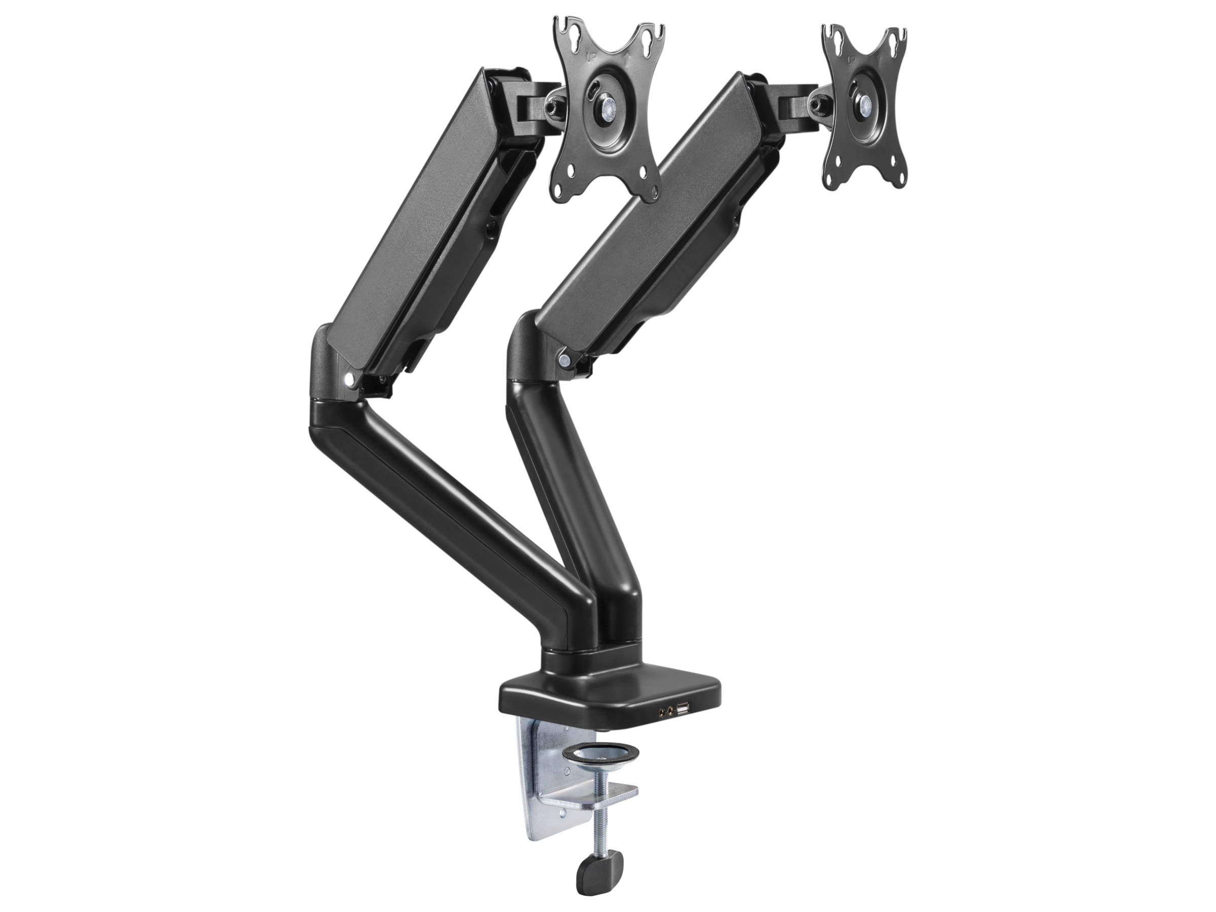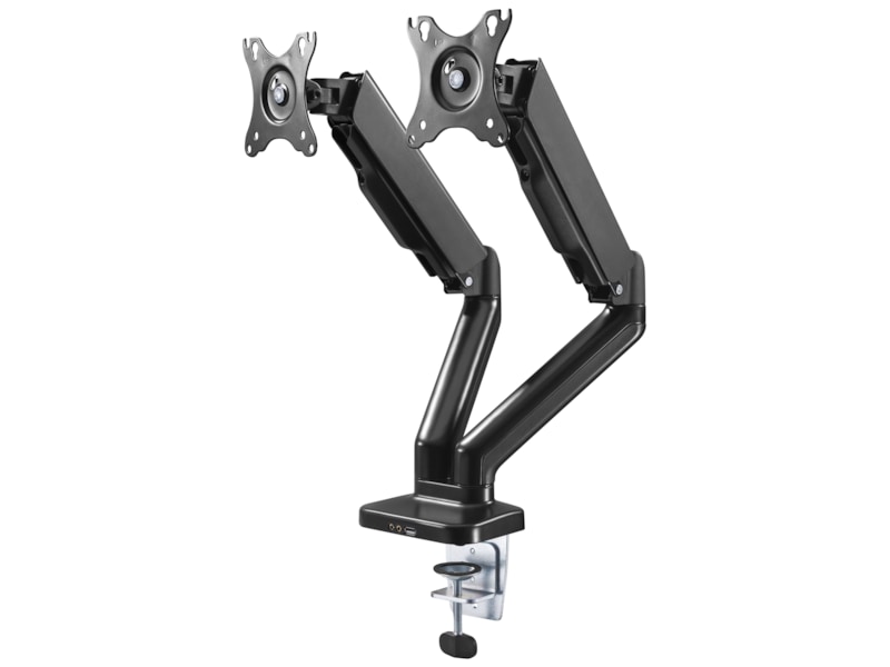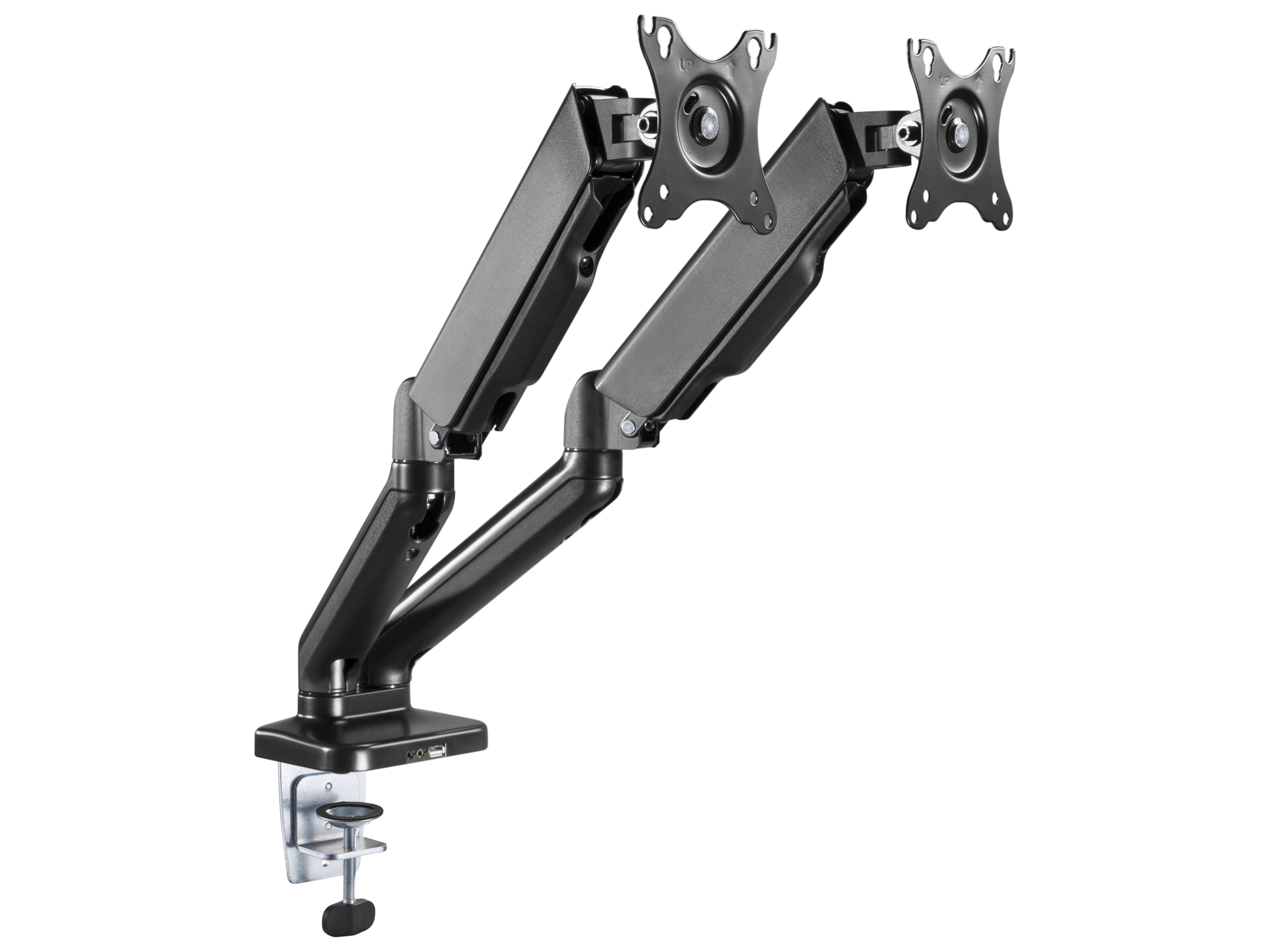 Monitorarmarna är utrustad med en gasfjäder och erbjuder en mängd justeringsmöjligheter för att minska trötthet i nacke och ögon samt hitta en bekväm arbetsposition. Du kan rotera varje skärm upp till 180 grader åt båda hållen, svänga dem med upp till 90 grader åt vardera sida och luta dem med upp till 90 grader uppåt eller nedåt. Oavsett om du har platta eller kurvade skärmar passar denna monitorarm båda typerna.