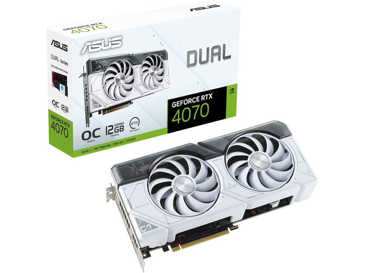 ASUS Dual GeForce RTX™ 4070 SUPER White Edition 12GB GDDR6X with two powerful Axial-tech fans and a 2.56-slot design for broad compatibility