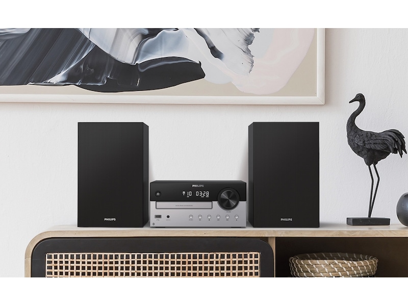 Med det här klassiska mikrosystemet kan du strömma musik och poddsändningar, spela CD-skivor och lyssna på FM-radio - allt med rikt 60 W ljud. Det är perfekt för ett vardagsrum eller vardagsrum med öppen planlösning, och du kan ansluta andra källor via USB eller ljudingång.