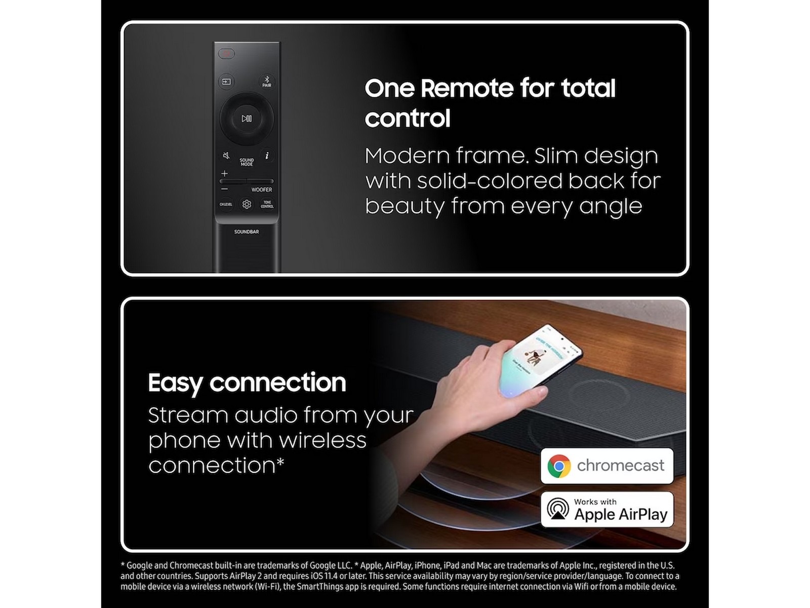 Q-Symphony levererar anpassat ljud i varje kanal genom både TV:ns och soundbarens front-, sido- och uppåtvända högtalare för en komplett akustisk upplevelse.