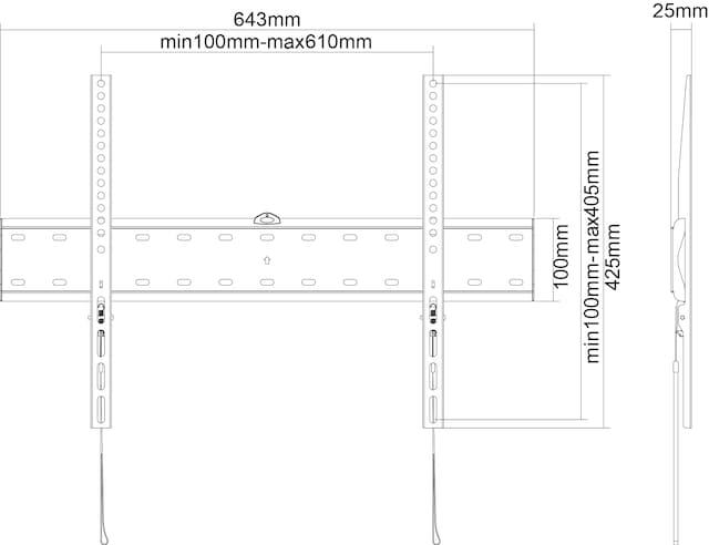 Fästet bygger endast 25 mm ut från väggen, vilket säkerställer att TV:n hänger mycket nära väggen för att smälta in bättre med omgivningen. Snörena som är dolda bakom TV:n är till för en smart fjäderlås som gör att du enkelt kan låsa upp den om du behöver lyfta ner TV:n från väggen.
