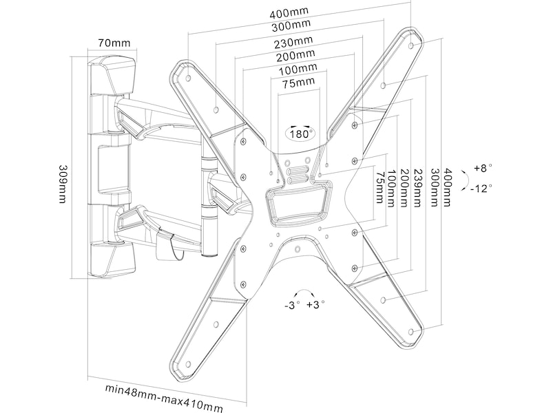 WMA 2.7 är både vrid- och tiltbart, vilket ger dig total frihet att anpassa vinkeln på TV:n nedåt, uppåt och åt sidorna. Väggfästet kan vridas +/- 90°, och tiltfunktionen är mellan -8° och 12°. Den stabila konstruktionen klarar en maximal vikt på 30 kg, och med den justerbara armen kan du dra ut TV:n upp till 410 mm från väggen. Hopfälld arm bygger bara 48 mm, så att TV:n elegant integreras med omgivningen.
