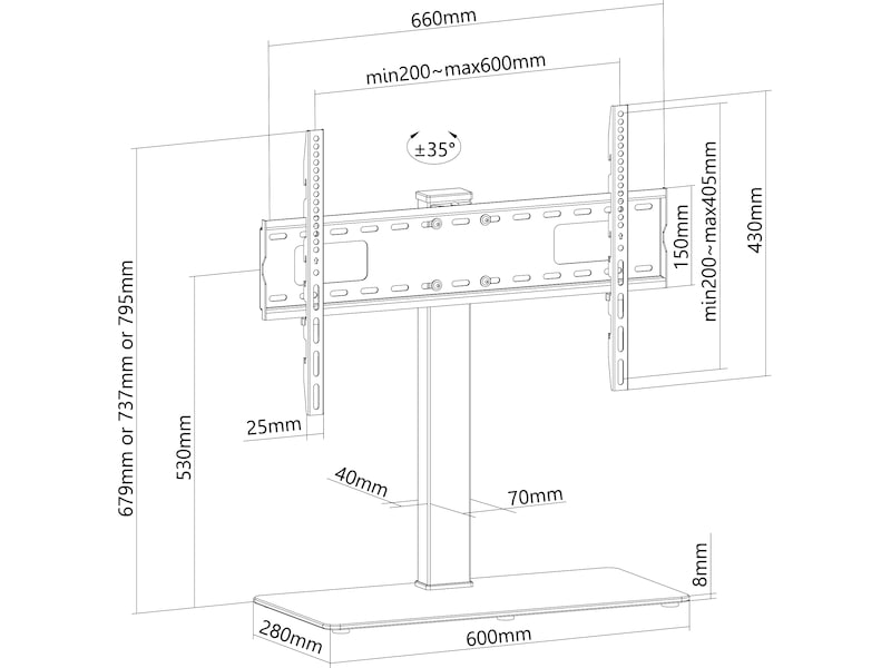 TV-stativet stöder VESA-standarden upp till 600x400 mm och är därmed kompatibelt med de flesta TV-modeller från 37 till 70 tum, med en maximal vikt på 40 kg. Stativet har fyra förinställda höjdnivåer, och du kan justera vinkeln från -35 till 35 grader för att uppnå en mer behaglig betraktningsvinkel som passar dina preferenser. Observera att det kan finnas begränsningar i höjdjusteringen vid montering av större TV-modeller.