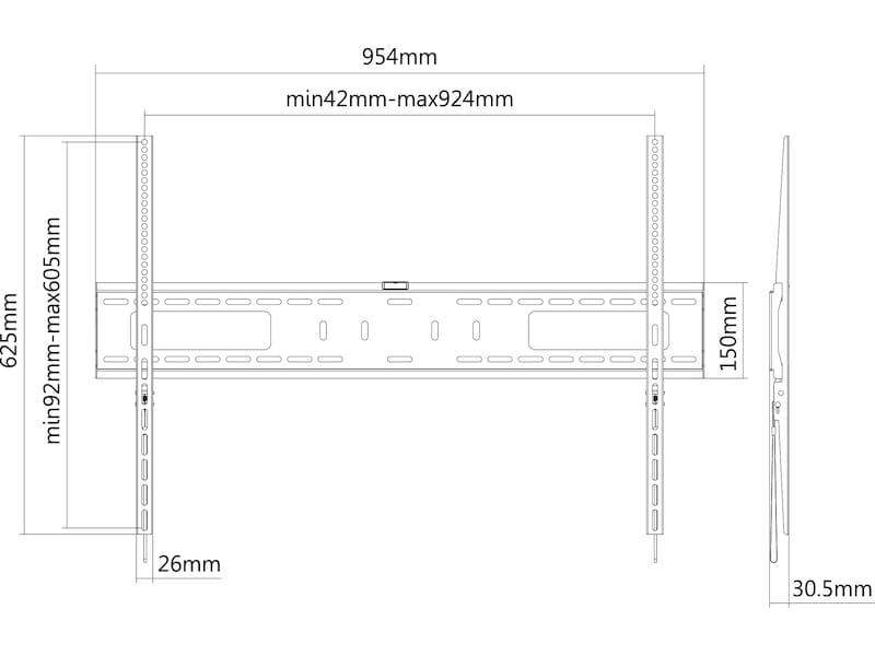 Detta väggfäste passar för mur-, betong-, gips- eller träväggar och möjliggör montering av TV-modeller från 60–100" med en maximal vikt på 75 kg. Beslaget har endast 30,5 mm avstånd från väggen, vilket gör att din TV kommer otroligt nära väggen för att smälta sömlöst in i omgivningen. Snörena bakom TV:n är till för en smart fjäderlås som gör det enkelt att låsa upp och därmed lyfta ner TV:n från väggen.