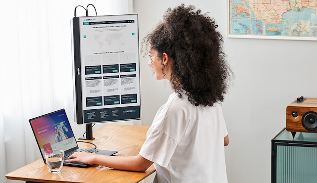 Bärhandtaget fungerar dubbelt som ett praktiskt stöd för att säkert stötta ZenScreen MB249C i 12–60° på vilken plan yta som helst, vilket säkerställer bekväma betraktningsvinklar. Den är perfekt för multitasking eller för demonstrationer för små grupper.