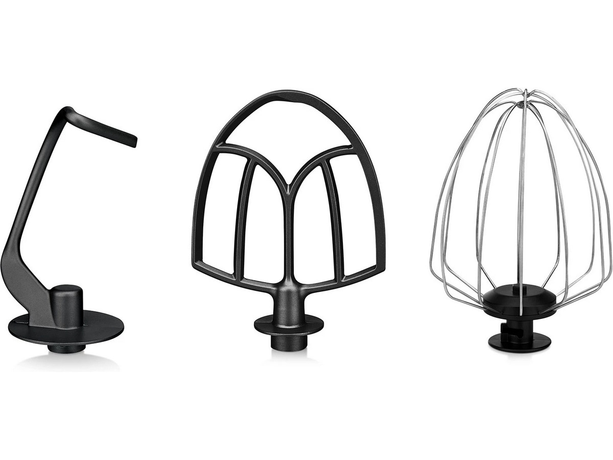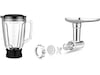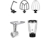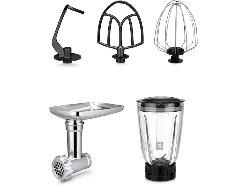Grovmalningsskiva, Korvtillsats, Kebbetillsats, Visptillsats, Medelmalningsskiva, Köttkvarnstillsats, Finmalningsskiva, Teflonbelagd degkrok, Mixertillbringartillsats, Teflonbelagd visp