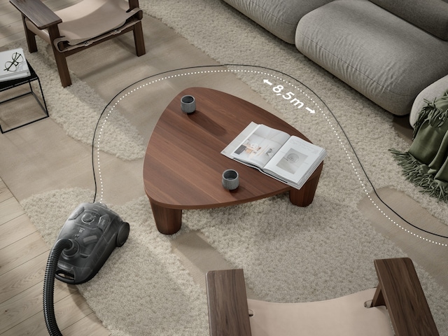 Denna ergonomiska dammsugare ger dig möjlighet att städa ytor på upp till 72 kvadratmeter utan att byta eluttag. Tack vare teleskoprör, stora hjul och 8,5 meters räckvidd, kan du enkelt förflytta dig och städa utan avbrott.