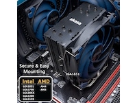 Högpresterande premium CPU-kylare utrustad med elegant helt svart kylfläns och lugn blå fläkt, intelligent PWM-hastighetsstyrning av 120 mm fläkt och 4 kopparrör. Utformad för CPU:er med en maximal TDP på 185 W.