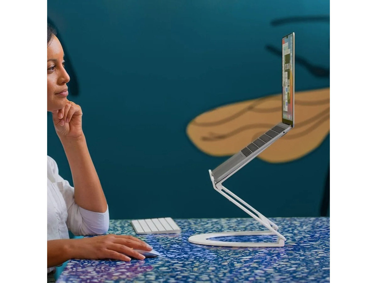 Möt Curve Flex, MacBook-stativet lika flexibelt och mobilt som MacBook. Placera Curve Flex som en skrivbordskil eller höj den för den perfekta skrivbordsinställningen. Böj stativet upp till 22 tum för videosamtal i ögonhöjd eller för att passa in din MacBook-skärm med din externa skärm. När det är dags att byta plats, vik Flex och sätt in den i den medföljande resehylsan i neopren.