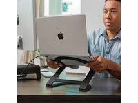 Bär din Curve Flex till kaféet och placera stativet som en praktisk skrivbordskil. Du kan justera både höjden och vinkeln på ditt tangentbord. När du kommer tillbaka till kontoret, höj Curve Flex till sin maxhöjd och din MacBook-skärm + webbkamera är i ögonhöjd och lika hög som din externa bildskärm!