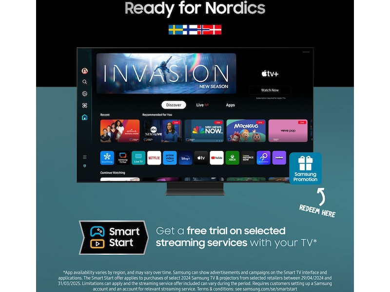 *Gäller vid köp av utvalda modeller av projektorer och utvalda 2024 års Samsung TV på samsung.com och hos utvalda återförsäljare under perioden 2024-04-29 – 2025-03-31. Begränsningar förekommer och streamingtjänsterbjudanden som ingår kan variera under kampanjen. Kräver ett Samsung-konto samt att kund skapar konto hos aktuell streamingtjänst. Villkor: samsung.com/se/smartstart
