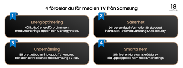 *Gäller vid köp av utvalda 2024 Samsung TV hos utvalda återförsäljare. Garantin är giltig i 10 år från köpdatum. Kräver en kopia på inköpskvitto samt registrering på Samsungs hemsida inom 90 dagar efter köp. Gäller köp av utvalda 2024 års TV-modeller till och med 31 Mars 2025. www.samsung.com/se/offer/offline/screen-burn-warranty/