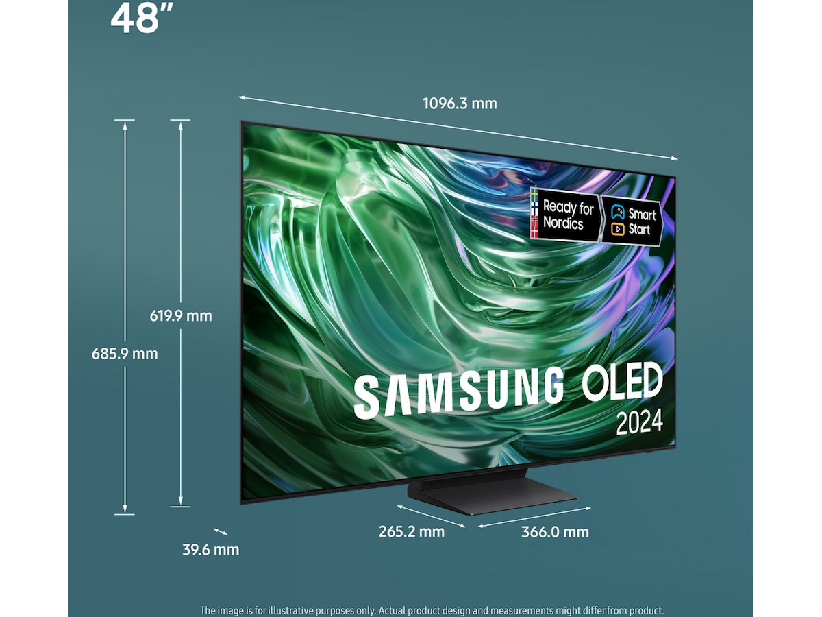 Skärm med ställ - 106.93 cm x 26.52 cm x 68.59 cm x 11.9 kg, Skärm utan ställ - 106.93 cm x 3.96 cm x 61.99 cm x 10.6 kg, TV-bänk - 36.6 cm x 26.52 cm |