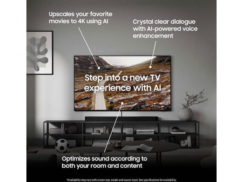 *Utbudet av appar och tjänster varierar över tid, då gamla kan upphöra och nya tillkomma. Vissa appar och tjänster kräver abonnemang eller engångsköp för att kunna användas. Samsung kan visa reklam och kampanjer på Smart TV-gränssnittet och applikationer. Skärmspegling fungerar endast när TV och mobil är påslagna och anslutna till samma WiFi-nätverk. Apple och AirPlay är varumärken som tillhör Apple Inc., registrerade i USA och andra länder/regioner. AirPlay kräver iOS 12.3 eller senare eller macOS 10.14.5 eller senare.