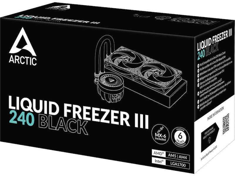 Liquid Freezer III är redo för omedelbar användning tack vare sina förinstallerade kylarfläktar i push-konfiguration. Fläktkablarna är integrerade i manteln på slangarna så att endast en kabel behöver anslutas till moderkortet. Med MX-6 termisk blandning som ingår i leveransen har du allt du behöver för snabb och enkel installation.